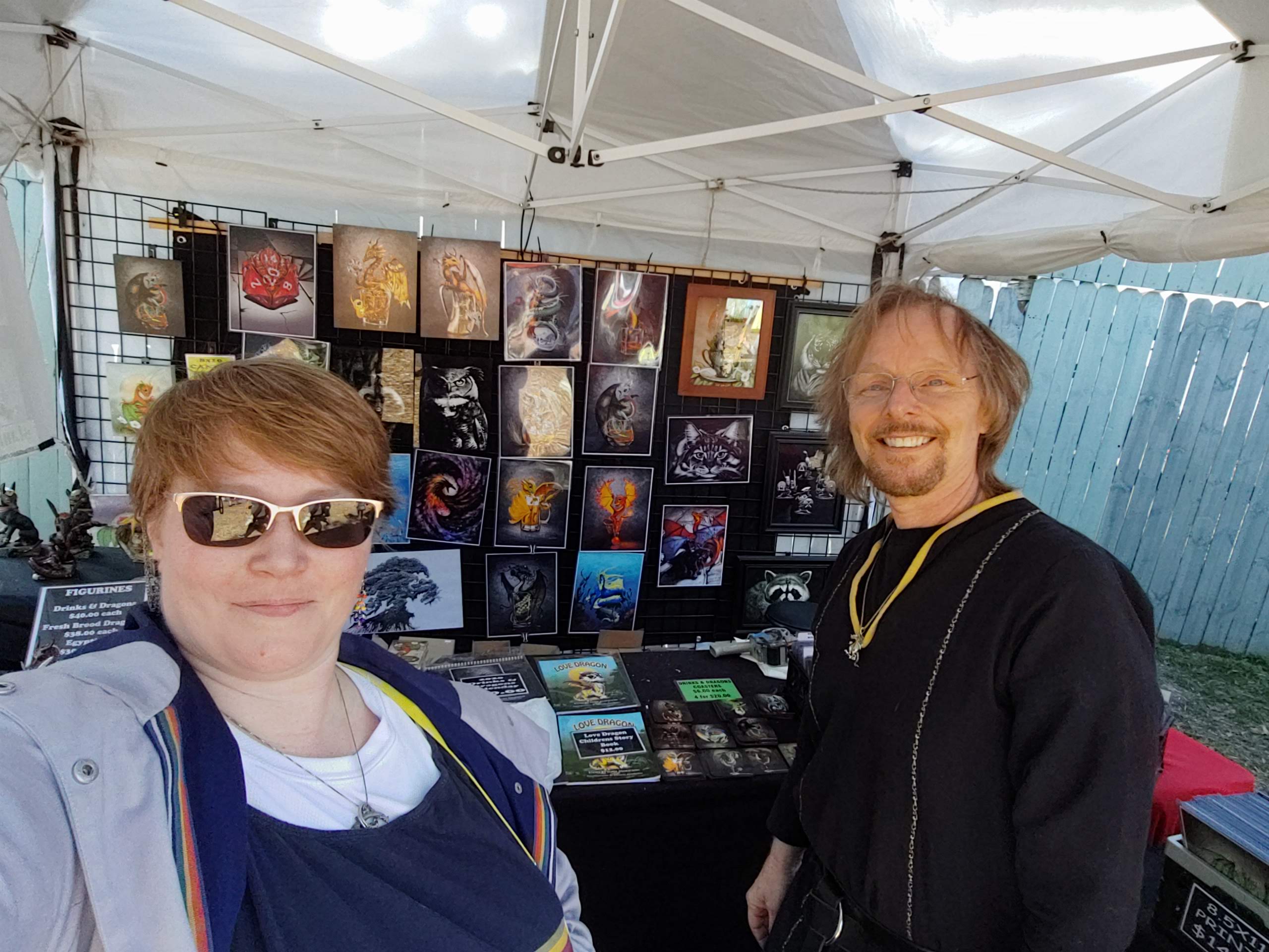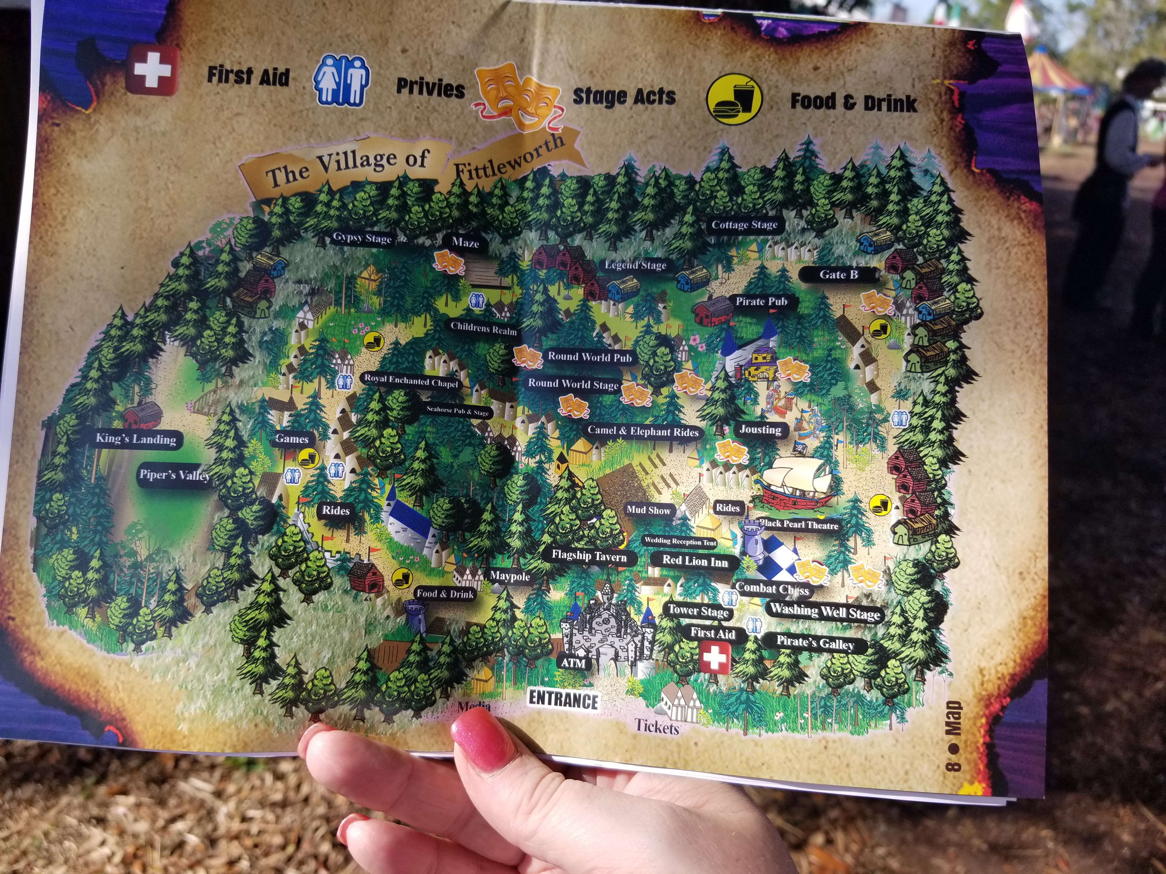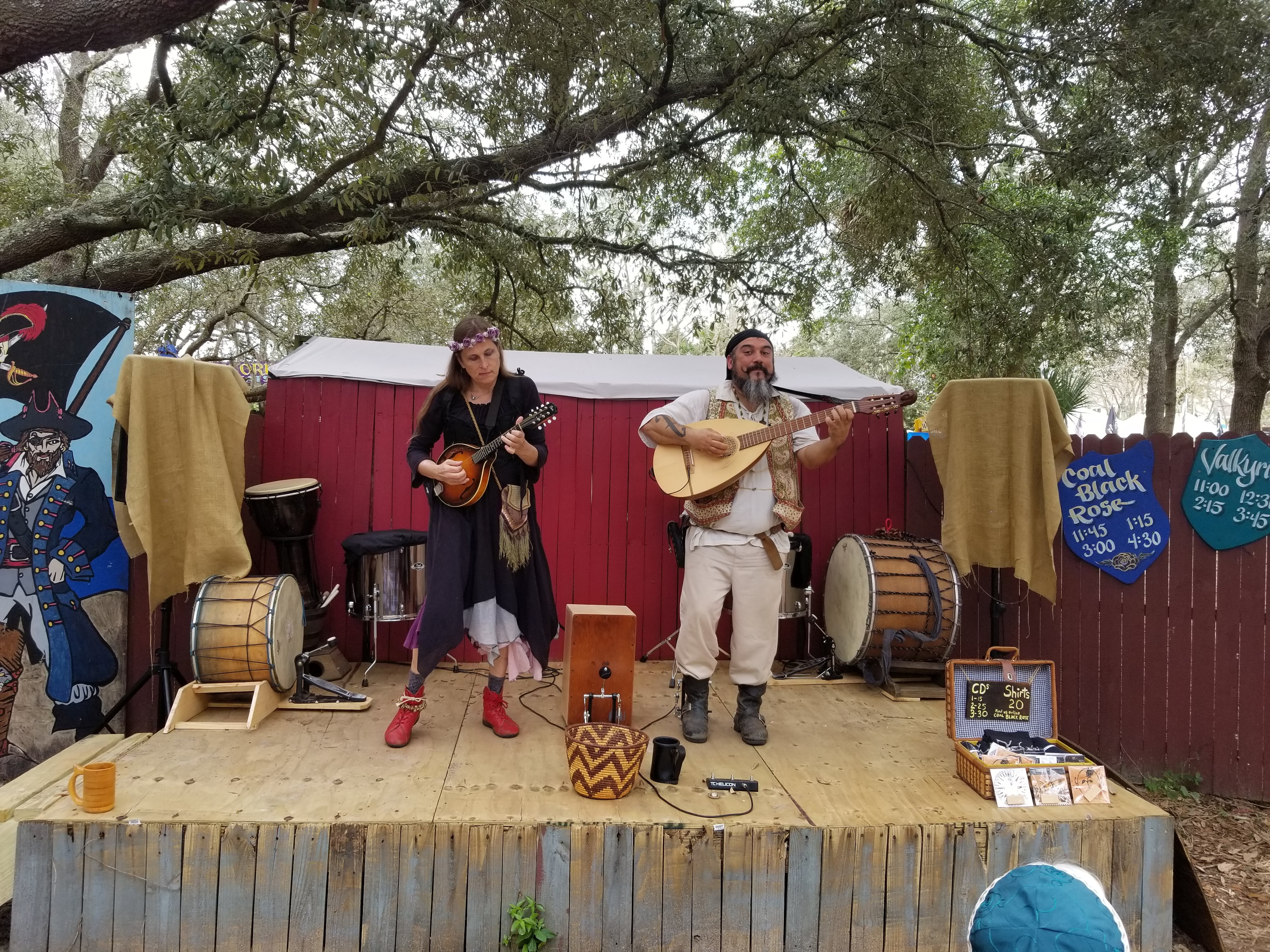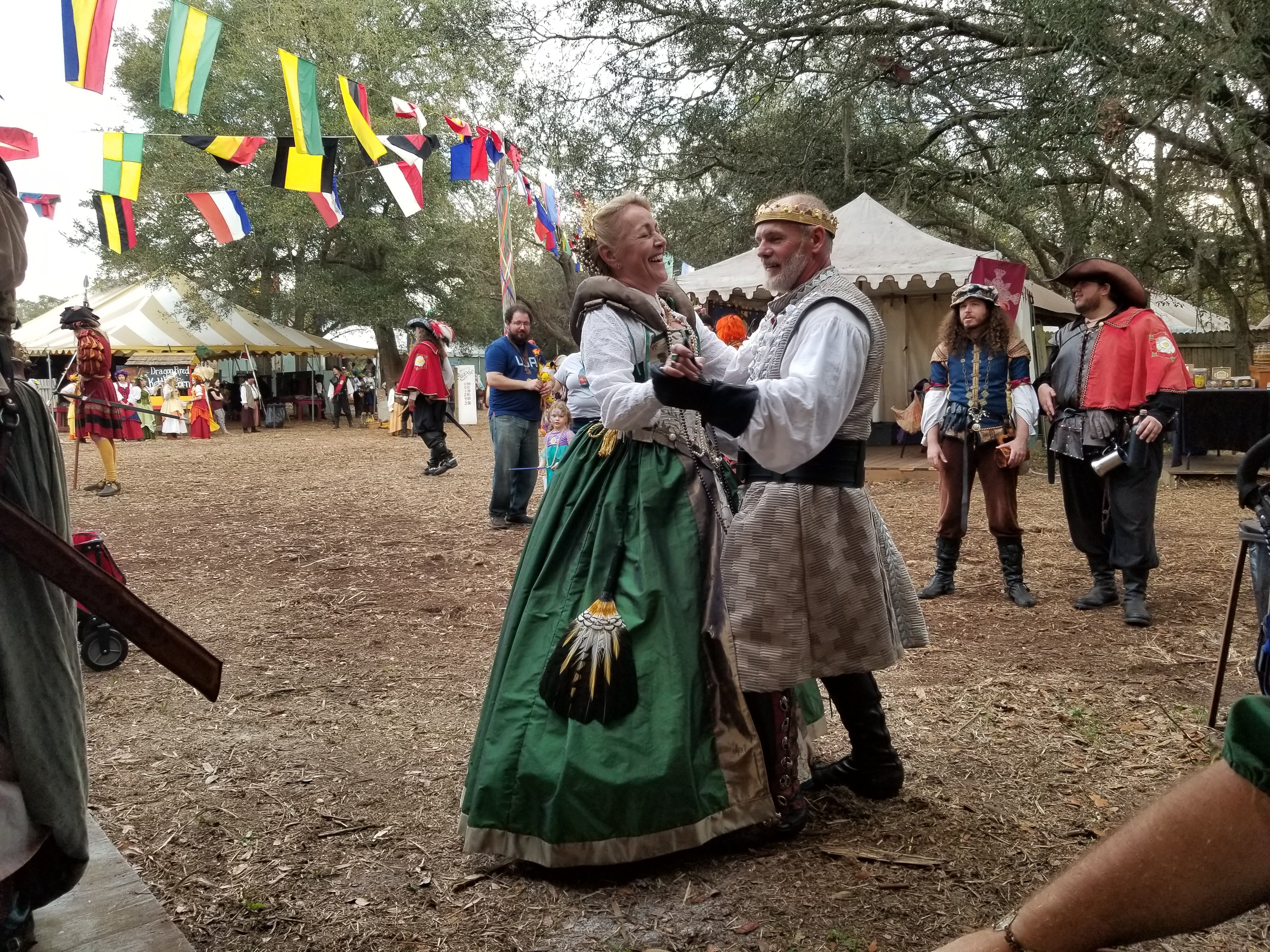 Starting at the top, these are my photos of: the map of the Village of Fittleworth; the metal medallion that they use for a season pass; a gifted female jouster who played the heel; a booth selling beautiful tropical plants called Queens Garden; a global musical group called Bocca Musica; the King and his new Queen dancing; me getting lots of use of a parasol I’ve had for decades, because the Florida sun is no joke, even if February; MN Ren Fest favorite Johnny Phoenix; the fantastic Demzarah Gypsies; traditional musicians Coal Black Rose; me with a Mandalorian Black Knight; drum and bagpipe musical group Pictus; me with prolific musician Jim Hancock (with the guitar) and other musicians (I unfortunately don’t recall their names); me with a mermaid; the band Valkyrik (a new favorite!); dragon artist Stanley Morrison‘s booth; and me with a new friend you will see all over the Florida Ren Fest and Pirate circuit, affectionately known as Pink.